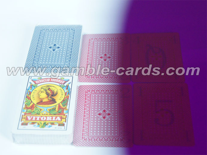 Blauwe kaarten:gemarkeerd met groot lettertype in het midden van speelkaarten.